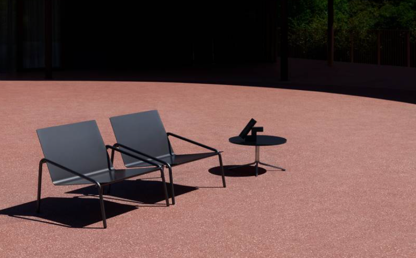 Resting naturally on a slender yet rigorous framework is a sheet of aluminium for the outdoor version of the Fillet armchair.